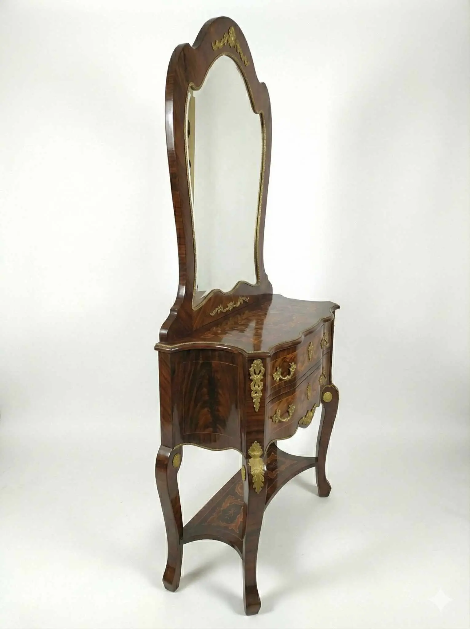 The console table features beautifully curved cabriole legs, a richly decorated lower shelf, and a front apron enhanced with marquetry-style motifs. The matching mirror complements the design with its sculpted frame, smooth curves and brass-accented details — creating a harmonious and visually stunning centerpiece.
