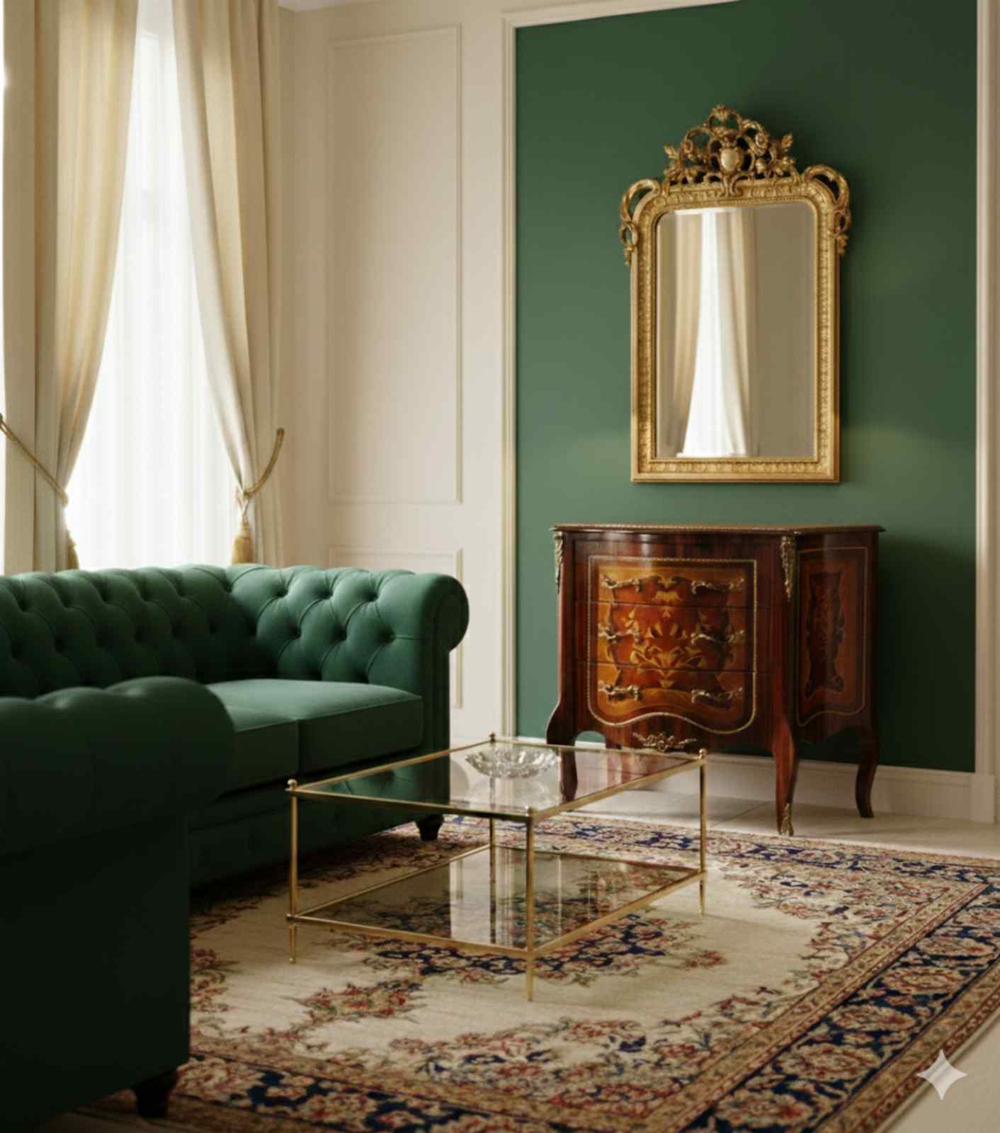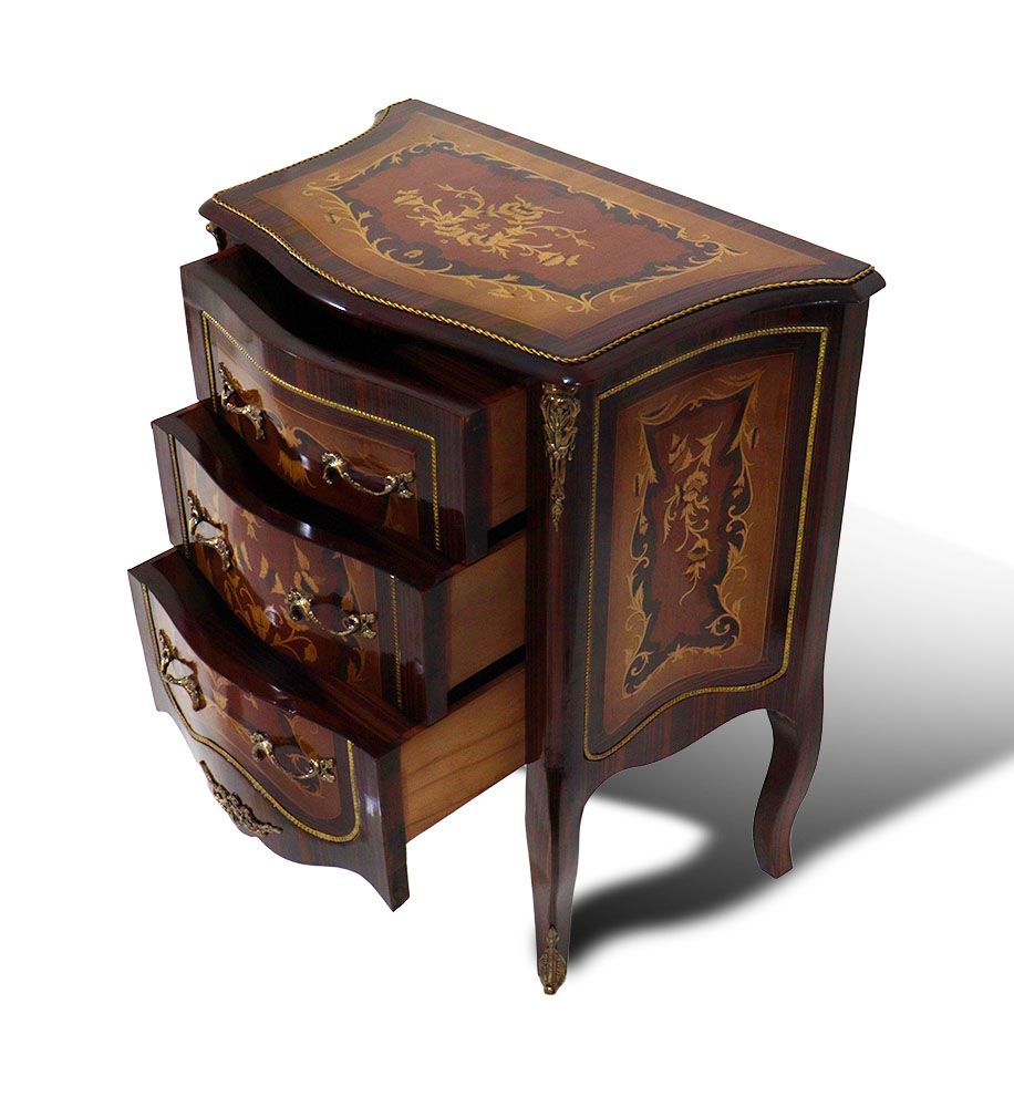 The baroque chest of drawers measures 70 cm in width, 40 cm in depth, and 80 cm in height. As a handcrafted piece, slight variations in wood grain, color tone, and marquetry pattern may occur and are considered a sign of authentic craftsmanship. The chest is intended for indoor use and is delivered fully assembled.
