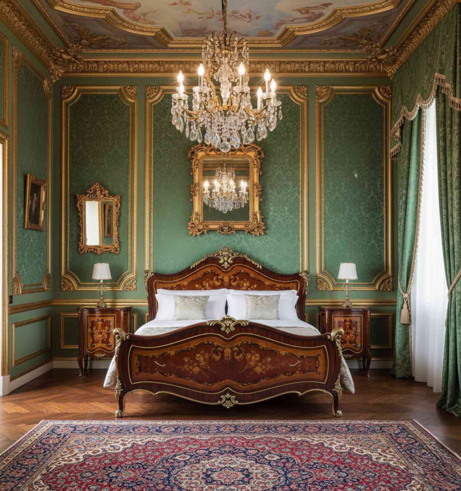 The solid wood body is enhanced with handcrafted marquetry inlay featuring classical floral and ornamental motifs. These intricate inlays add depth and texture to the surface and reflect traditional European furniture craftsmanship. A high-gloss lacquer finish enhances the richness of the dark brown color while highlighting the gold-toned decorative details.