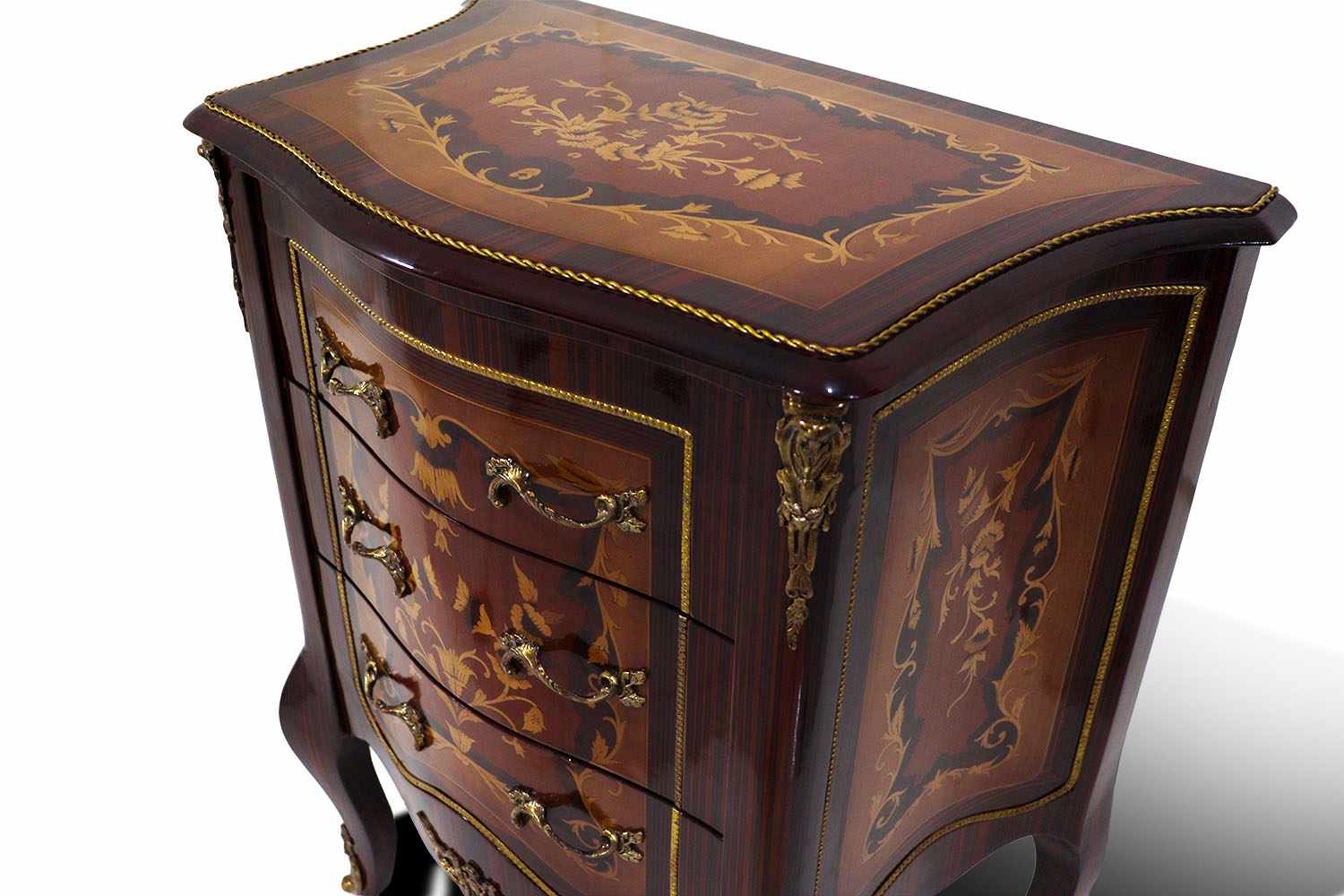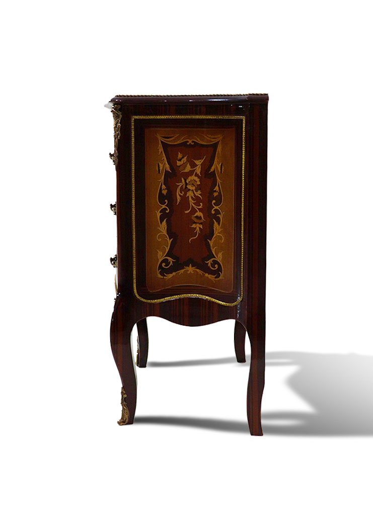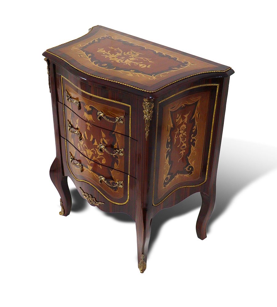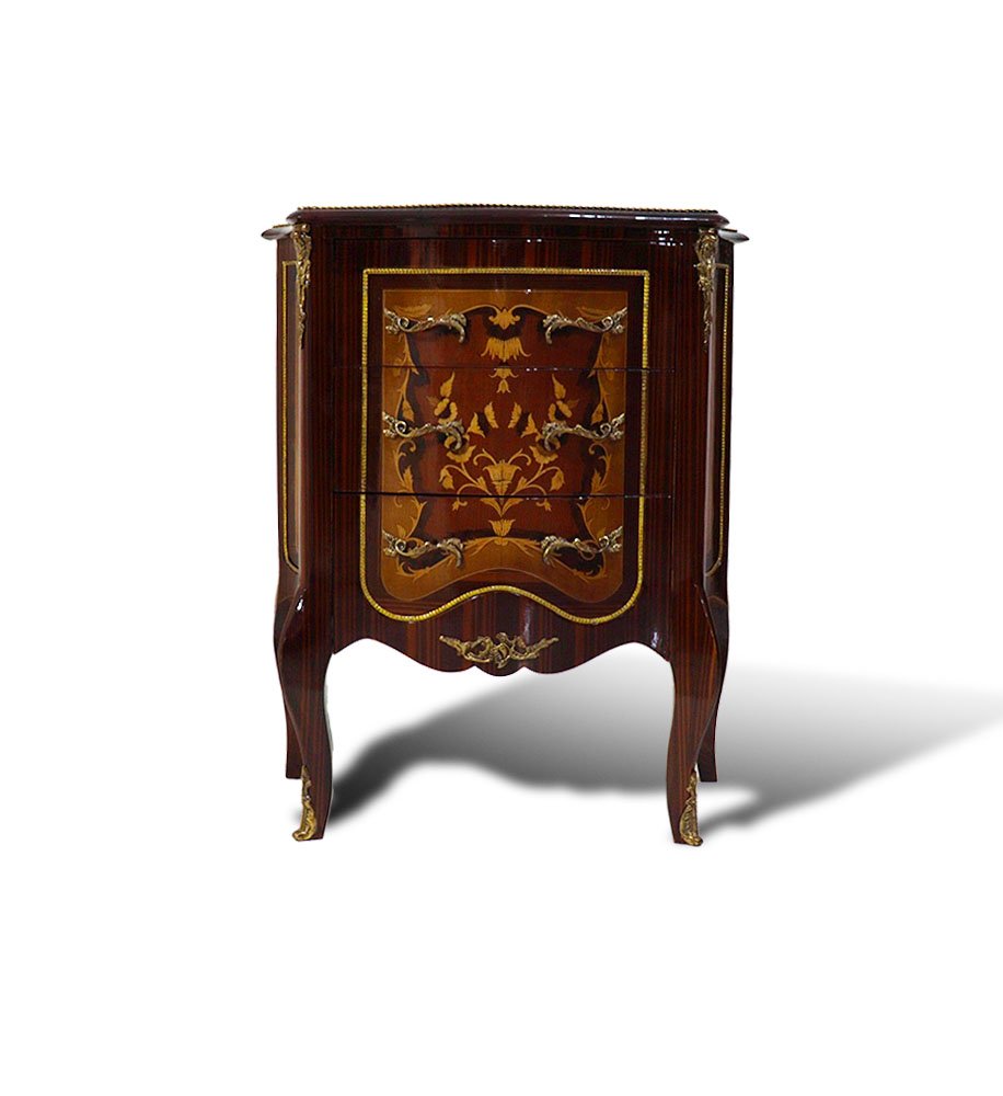 The chest is equipped with three drawers that provide functional storage space. Decorative brass handles complement the marquetry and reinforce the baroque aesthetic. Curved Louis XV legs add visual lightness and ensure stability, completing the classical design.