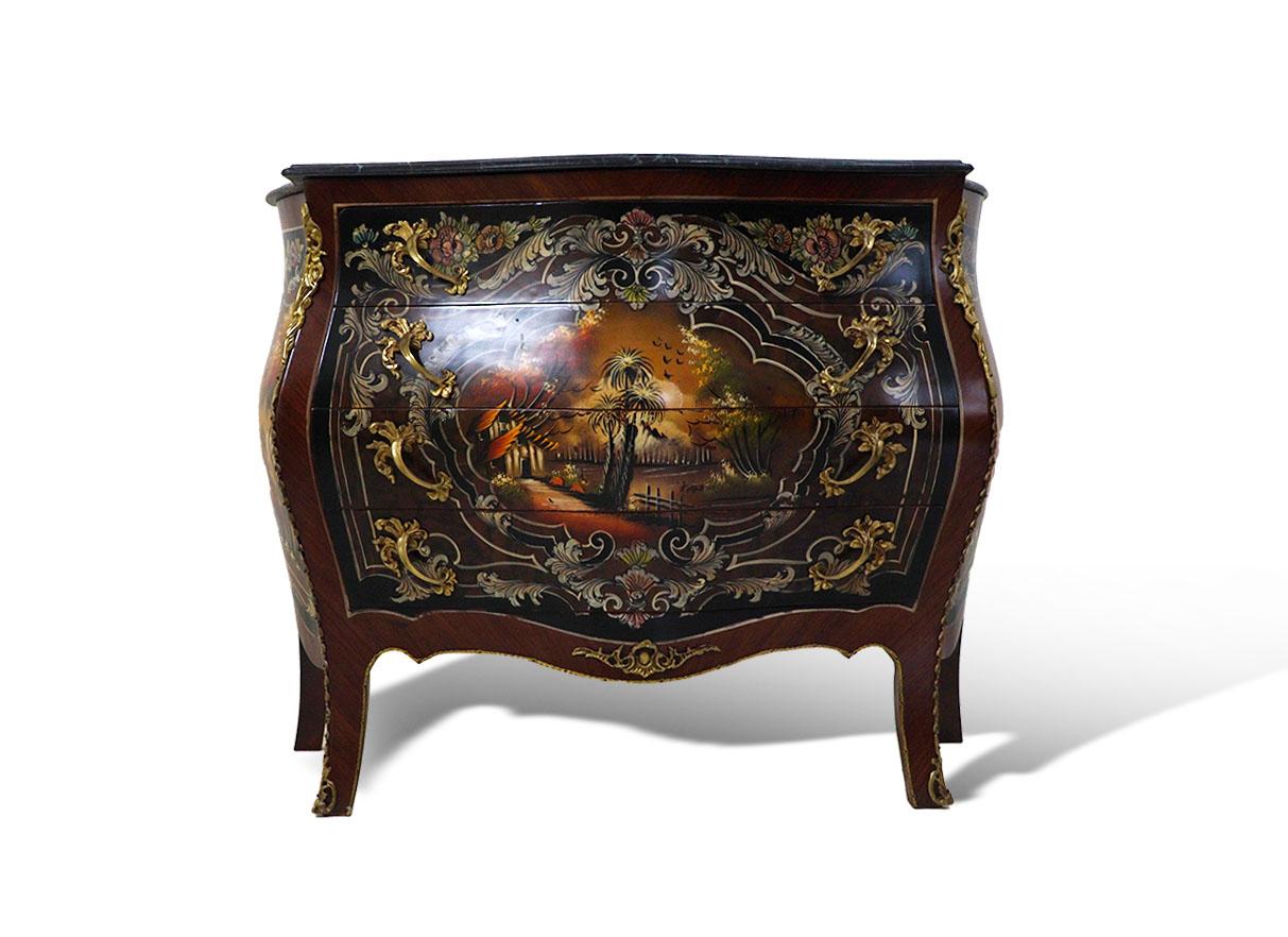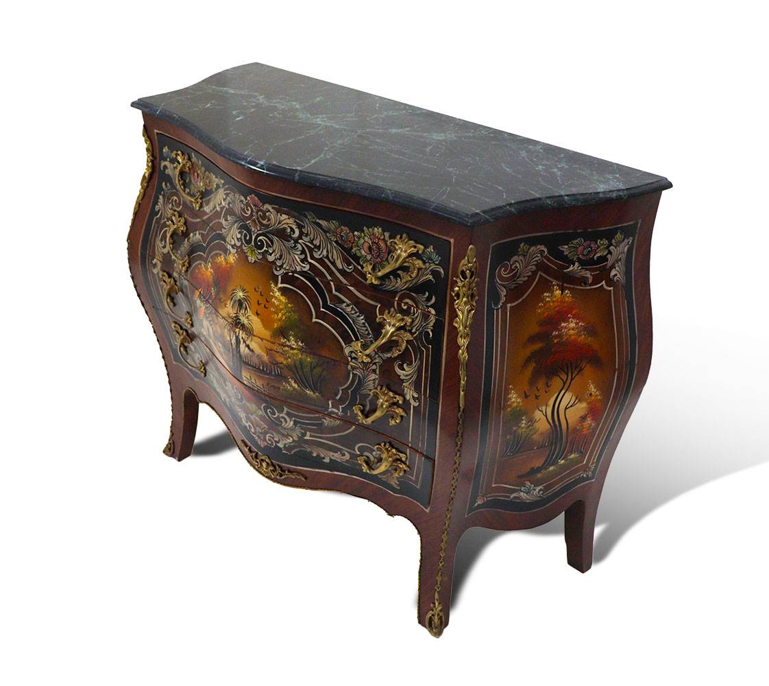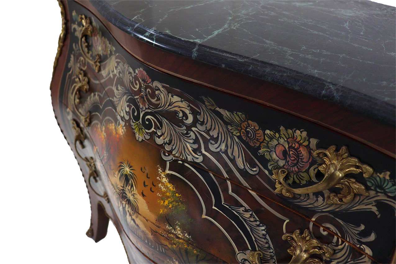 This baroque Rococo chest of drawers by MACE Heritage combines French Louis XV elegance with hand-painted oil artwork and premium materials. Crafted from solid wood, finished in high-gloss lacquer, and topped with natural marble, it is a refined statement piece for luxury residential and commercial interiors.