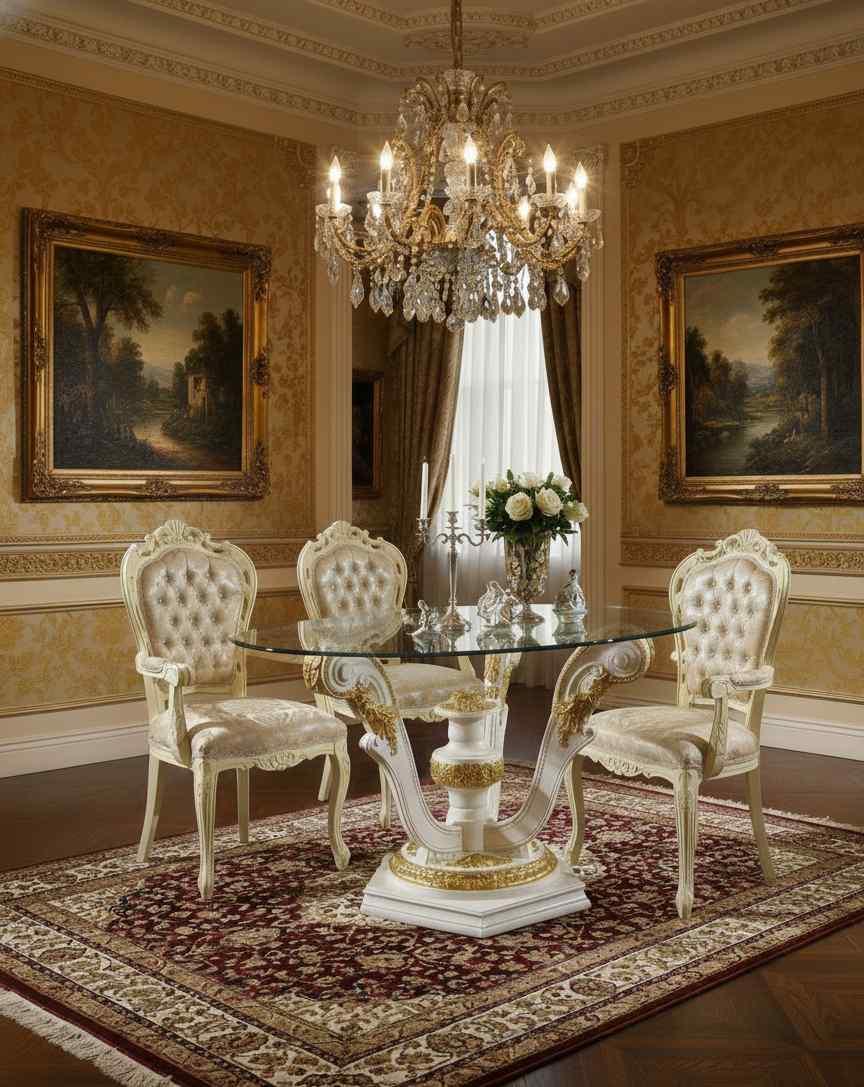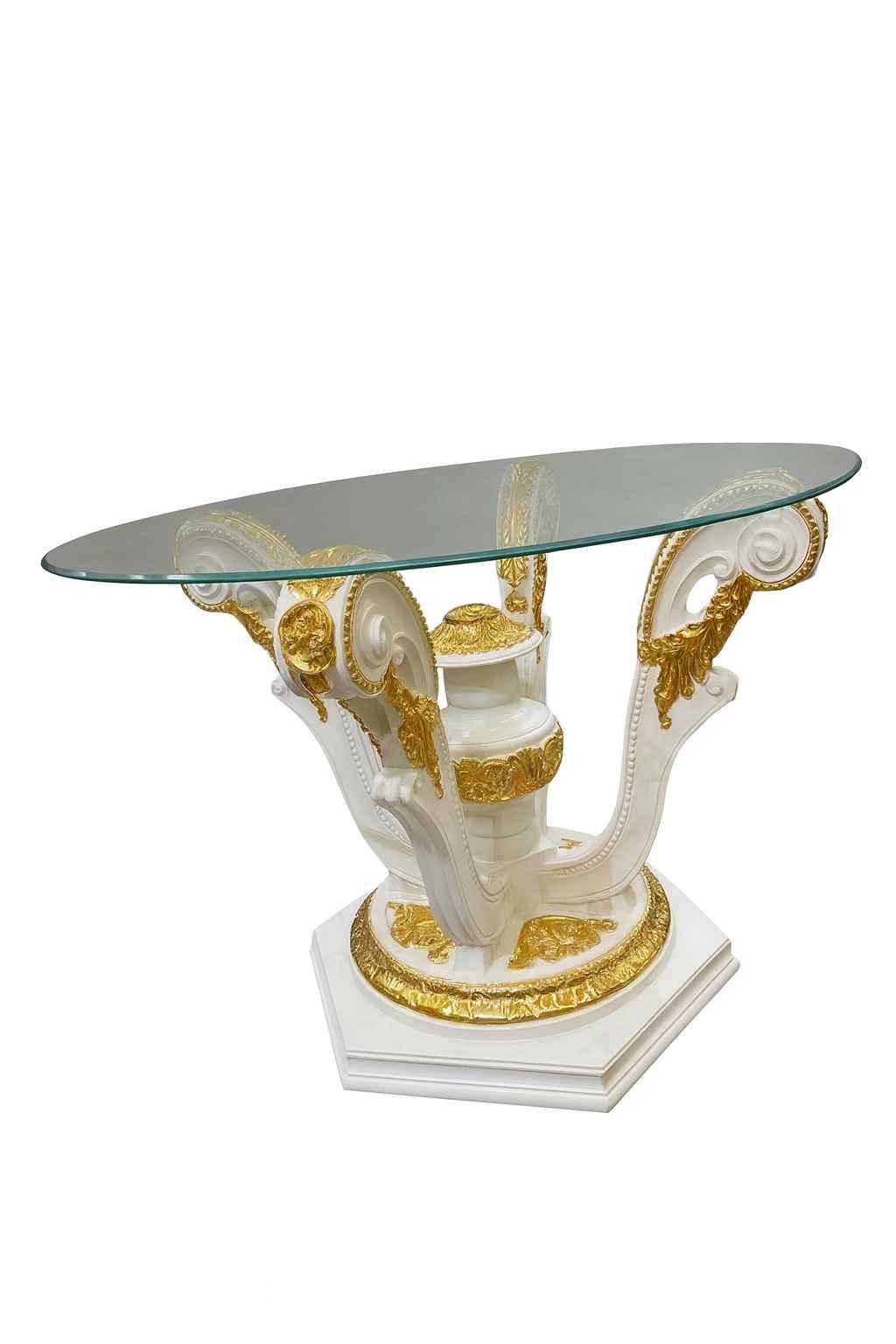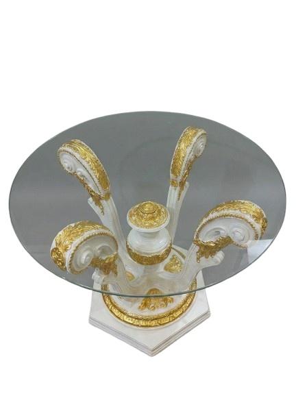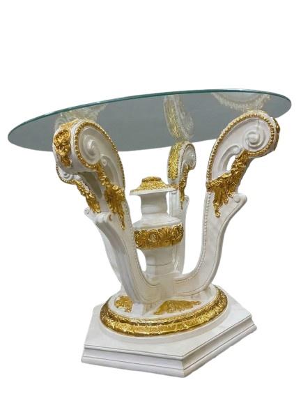 The MACE Heritage Baroque Glass Table is an extraordinary fusion of dramatic classical design and artisan craftsmanship. Its sculptural base is made from solid, hand-carved wood, finished in a refined white-and-gold color palette that highlights each curve, scroll, and ornamental Baroque detail.