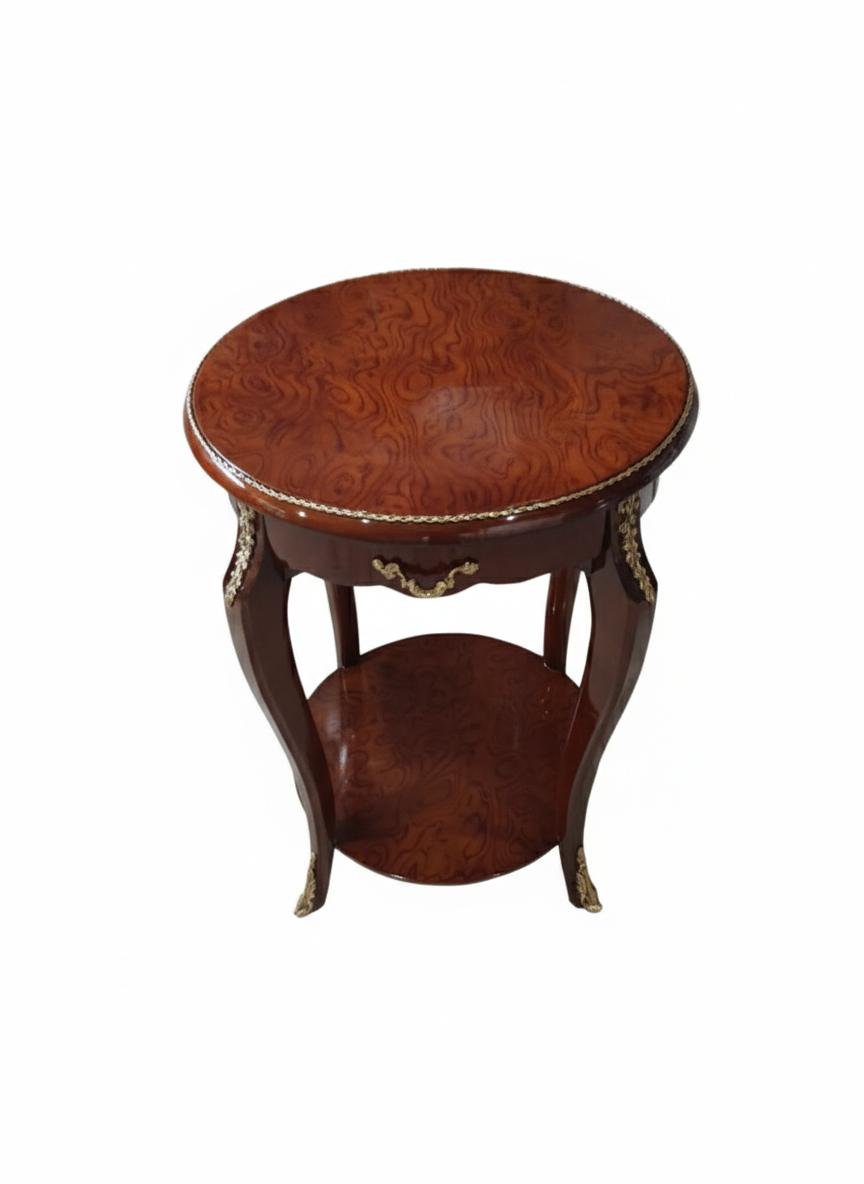 The MACE Heritage Baroque Round Side Table is a refined statement piece that combines classical elegance with functional design. Crafted in a warm brown wood finish, the tabletop features an exquisite veneer pattern inspired by traditional European furniture craftsmanship. The gently curved silhouette, decorative brass accents, and ornate detailing give this table its unmistakable baroque character.
