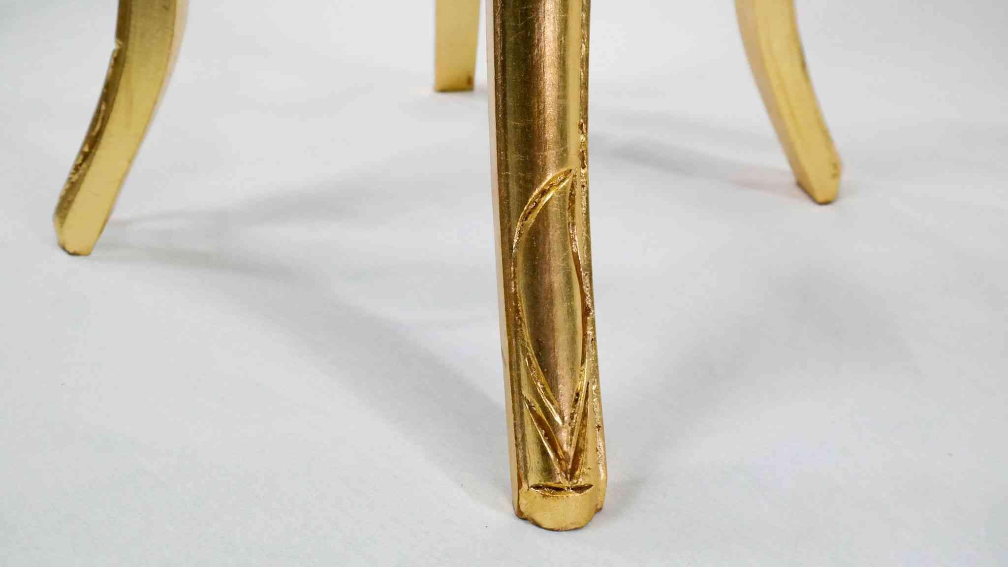 Der massive Holzrahmen wird mit goldenen Blattelementen veredelt, die dem Tisch das charakteristische Erscheinungsbild eines klassisch-barocken Möbelstücks verleihen. Die Veredelung orientiert sich an historischen Vorbildern und sorgt für eine elegante, zeitlose Optik mit antikem Charakter.