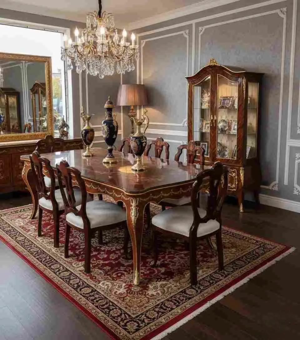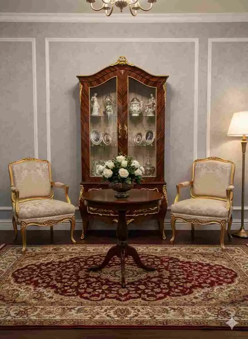 Die Barockvitrine „Rocaille Élégance“ von MACE Heritage ist eine handgefertigte Luxus-Glasvitrine aus Massivholz in Dunkelbraun mit goldfarbenen Messingakzenten und edler Satin-Innenausstattung. Geschwungene Glastüren, zwei großzügige Glaseinlegeböden und eine untere Schublade verbinden repräsentative Präsentation mit praktischem Stauraum. Ideal für anspruchsvolle B2C-Interiors sowie für B2B-Einsatz in Hotels, Empfangsbereichen, Showrooms und stilvollen Ausstellungsräumen. Maße ca.: 120 x 53 x 205 cm (B x T x H).